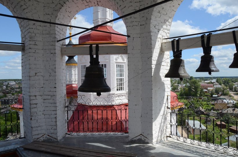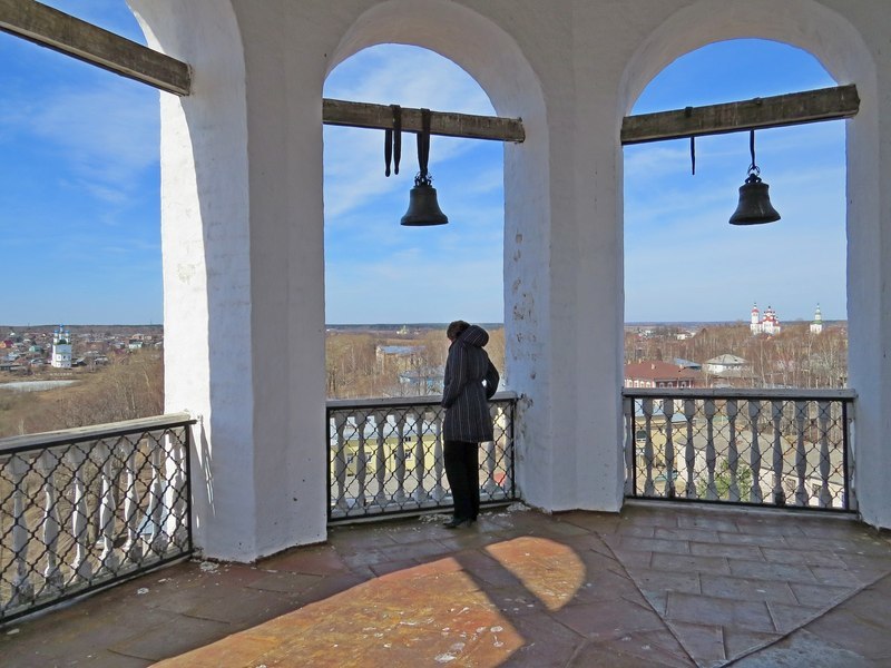 Звонница Входоиерусалимского храма на ул. Входоиерусалимской (Музей мореходов). Это самое высокое место для обзора. Интересно тем, что колокольня действующая. Деньги для колоколов собирали всенародно, благодаря акции «Колокольный звон Тотьмы». Перезвон передается через видеотрансляцию во время традиционных телемостов между Тотьмой и крепостью Форт Росс в Калифорнии. Правда, попасть сюда можно лишь в теплое время года.