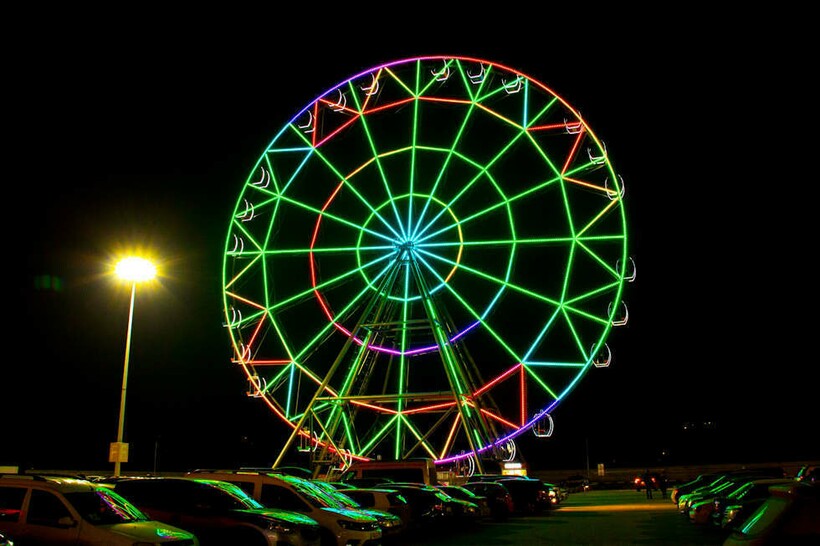 Карусель состоит из 24 кабин, каждая из которых рассчитана на 6 человек. В темное время суток включается подсветка разноцветными огнями, колесо поднимается плавно. На полный оборот аттракциона потребуется 10−15 минут.