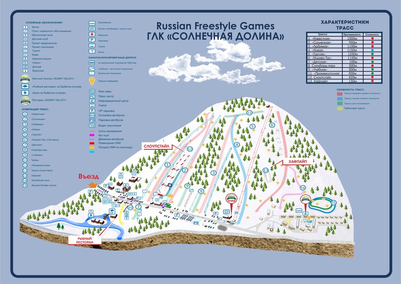 На территории горнолыжного комплекса есть трассы всех уровней: от начального до уровня профессиональных спортсменов. Общая протяженность трасс составляет 7 километров (всего 11 трасс) с перепадом высот в 230 метров (верхняя точка — 580 м). Непосредственно на курорте вы можете взять в аренду снаряжение и воспользоваться услугами инструкторов (от 300 рублей\час). Также можно снять домик или номер, не выходя за территорию комплекса, но это обойдется вам значительно дороже (от 1900 до 9500 рублей\сутки за номер; 15000 рублей\сутки — за целый коттедж).