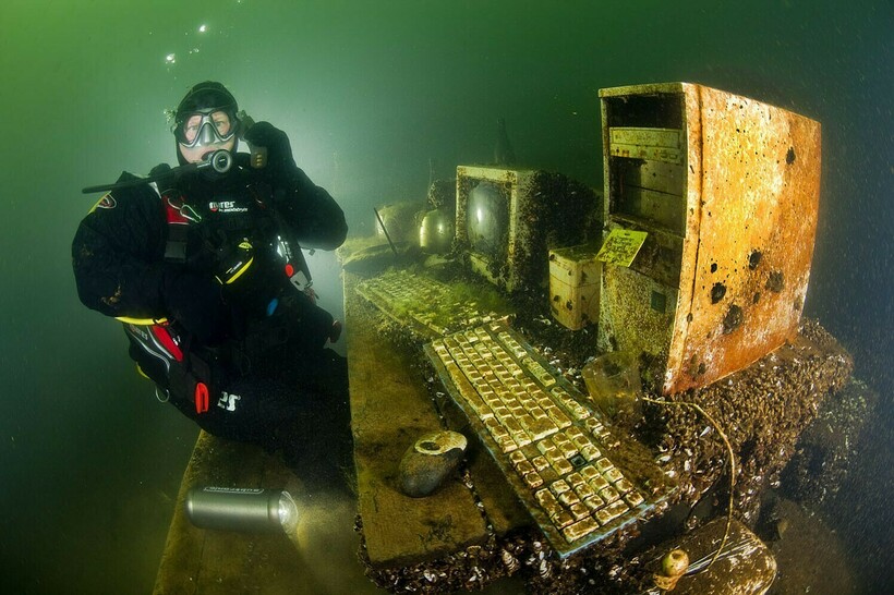 ЭТО ИНТЕРЕСНО! На глубине есть и совсем необычные экспонаты: затонувший офис на фото Константиновского карьера в Твери наводит на мысль об известном выражении «офисный планктон».