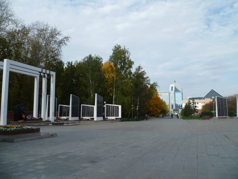 Здесь тоже есть вечный огонь. А еще — несколько каменных глыб, на которых высечены сотни фамилий тюменцев, погибших в Великой войне. Композицию дополняет стела в виде свечи. А чуть поодаль стоит бронетехника — как память, и чтоб ребятишки полазали.