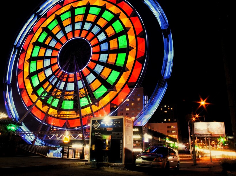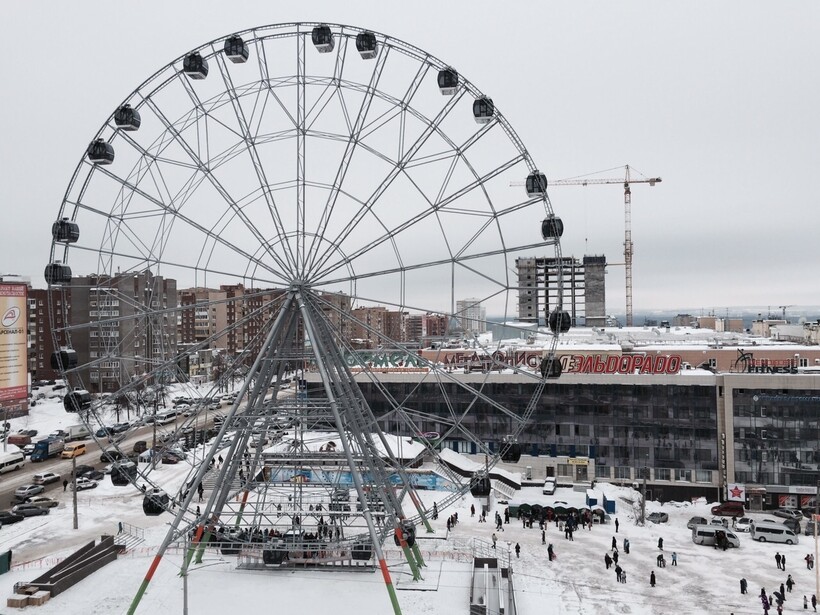 Колесо обозрения «Иремель» в Уфе находится между одноименными торгово-развлекательным центром и гостиницей. У подножия — детский мини-парк развлечений.