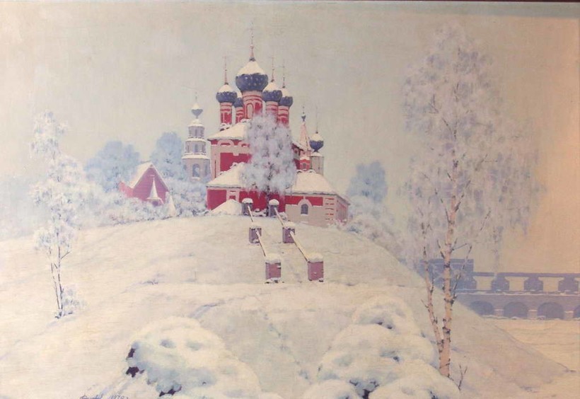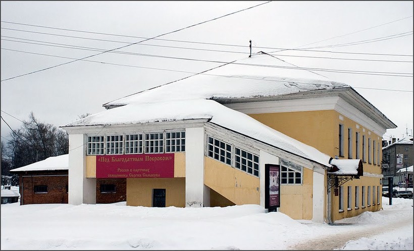 В этом здании находится касса, а экспозиция посвящена, главным образом, живописи. Это и иконы, и фамильные портреты угличских купцов и дворян. Кроме того, во время моего посещения там проходила выставка, посвященная 100-летию со дня рождения художника Ивана Соловьева, уроженца деревни Поповичево, расположенной как раз под Угличем. Среди представленных полотен многие посвящены этому городу.