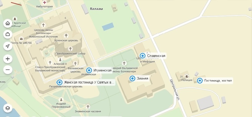 - «Славянская» — расположена за пределами монастырского комплекса прямо за зданием бывшей гостиницы «Зимняя». В гостинице простые номера по цене от 2 000 рублей. Номера нужно бронировать заранее по телефону или по электронной почте. Телефон для брони: +7-921-462-96-52.
