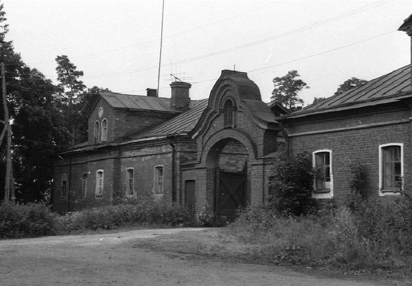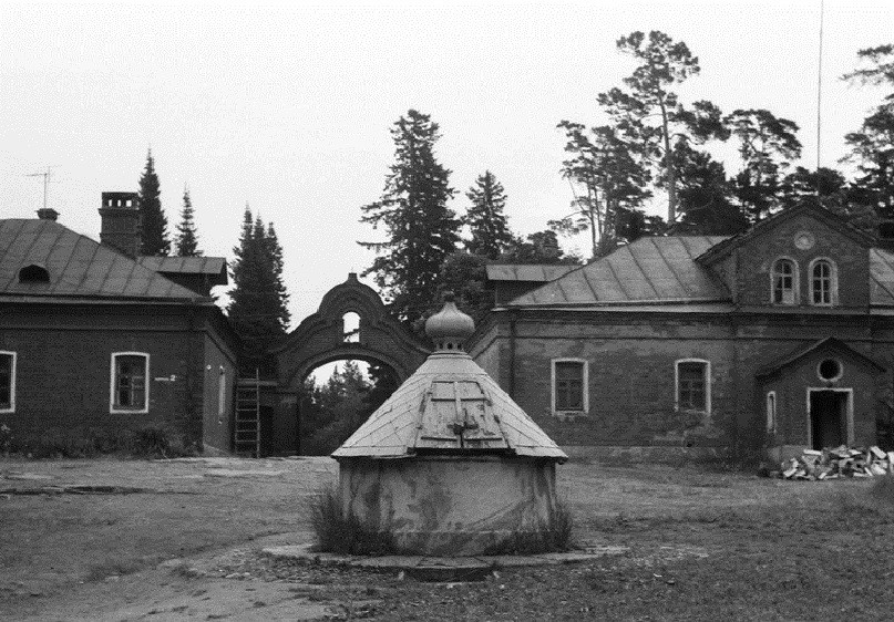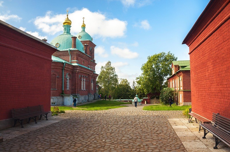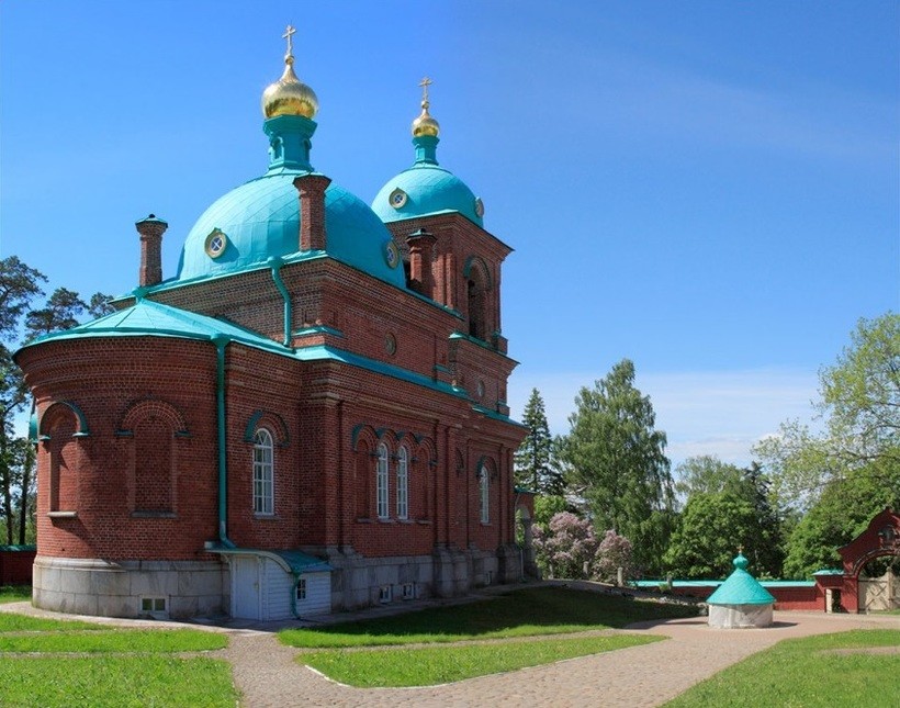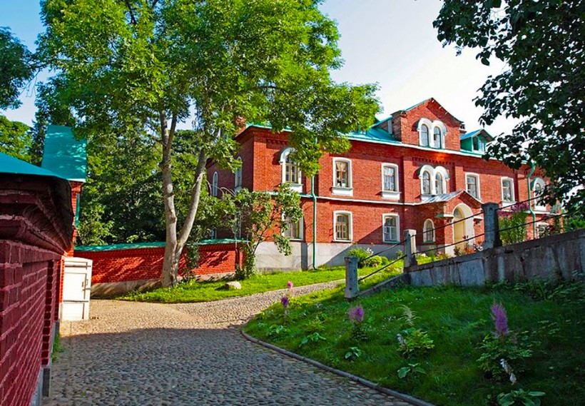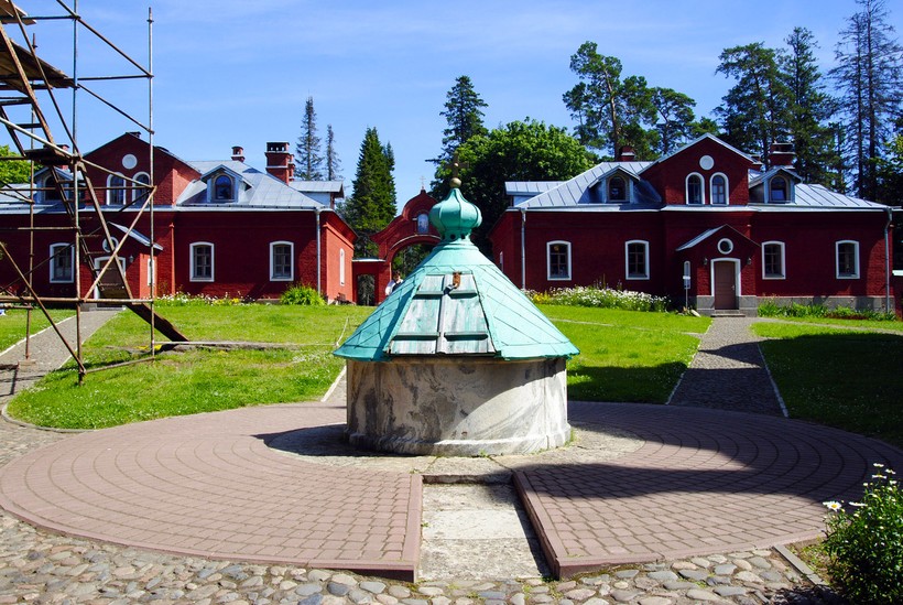 Все постройки на территории возведены из массивного красного кирпича, который был произведен на Валааме.