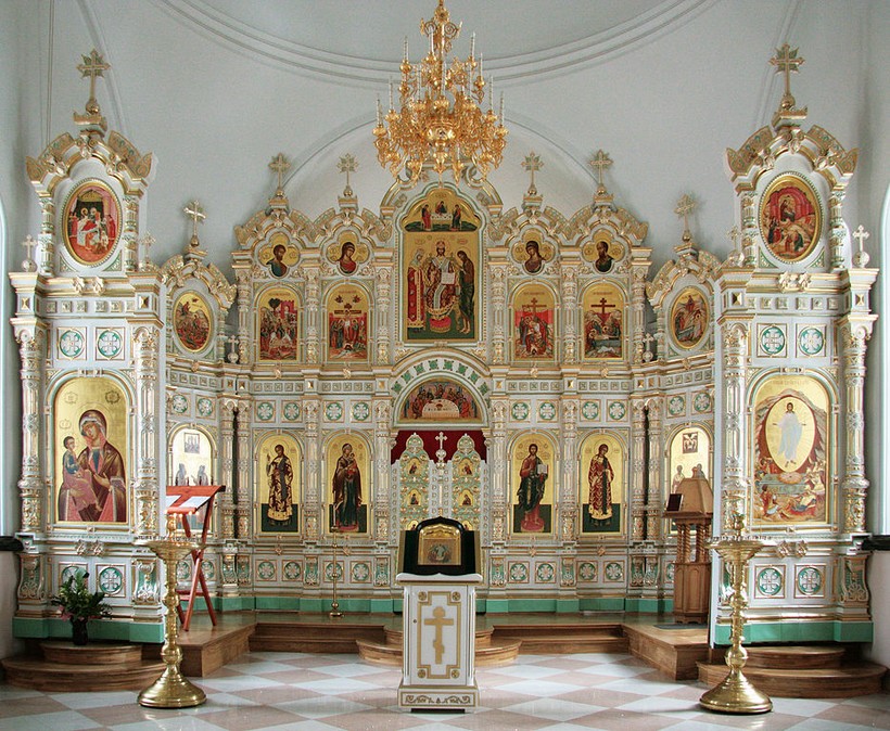 В верхнем храме хранятся редкие иконы, которые выразительно смотрятся на белых, обильно освященных стенах. Но главную гордость представляет фарфоровый, двухъярусный иконостас с изумрудной отделкой.
