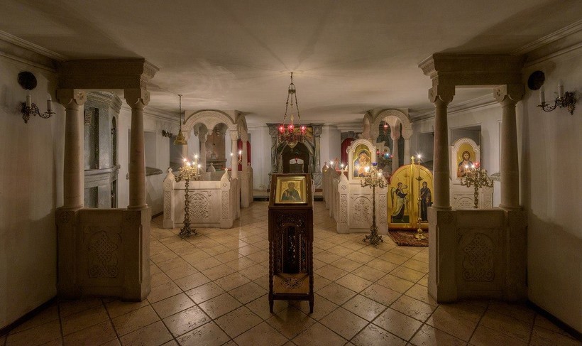 Выйдя из верхнего храма и спустившись на несколько ступеней вниз по лестнице, вы оказываетесь у входа в таинственное место — храм апостола Андрея Первозванного. Пройдя притвор, вы попадаете в помещение совершенно противоположное по атмосфере и стилю верхнему храму. Небольшое пространство с низкими потолками в сумеречном полумраке.