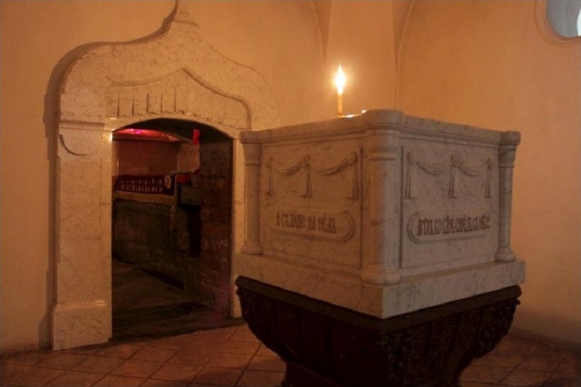 Рядом вход в святилище, где стоит копия лавицы (каменное ложе, на котором лежало тело Иисуса Христа в Иерусалиме). Тут хранится частичка Гроба Господня; подлинная, привезенная со Святой земли. Над этим сооружением висит семь лампад и одна из них - неугасимая.