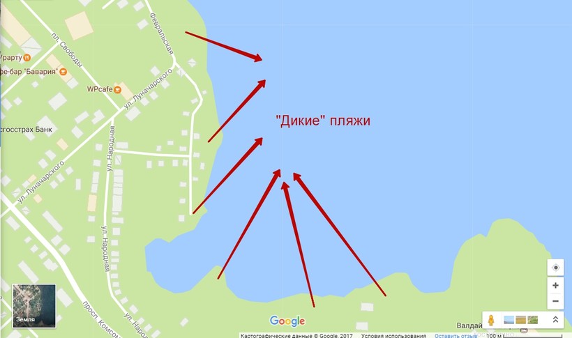 Оборудованные пляжи на Валдайском озере находятся на территории местных гостиниц и турбаз. Местные жители купаются на неогороженном участке берега, но, кстати, мало кто отваживался заходить в воду: она была очень холодной, даже сидеть возле озера без покрывала было зябко. Местные купаются на берегу озера, в разных "диких" местах, которые я указала на карте.