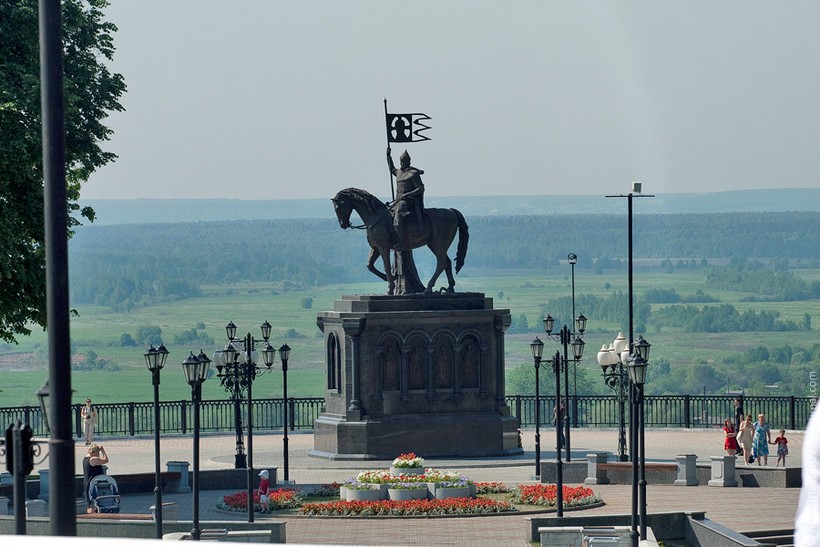 Это просторная площадь неподалеку от Успенского собора. Пройдите сквозь сквер, и вот — вам открываются просторы Клязьмы, виды на исторические здания, а вдалеке — новые районы Владимира как напоминание, в какой эпохе мы все-таки находимся.