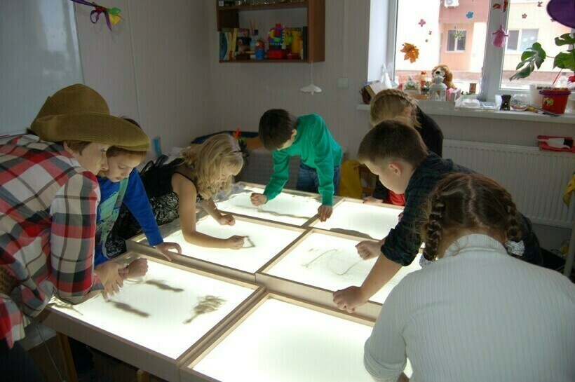 В студии детей от 3 лет обучают рисовать песком на стекле, создавать песочные картины в сосудах и на бумаге. Для малышей здесь есть безопасно оборудованная песочница с игрушками. По отзывам посетителей занятия интересные, педагоги отзывчивые, комната для малышей чистая.