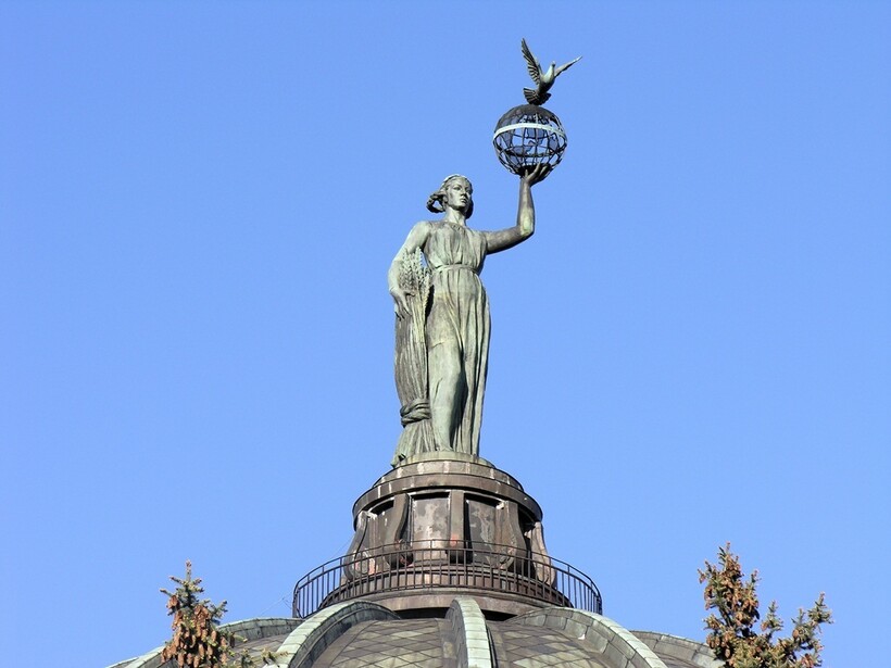 По сторонам входной аллеи с цветниками видны скульптуры «Астрономия» и «Познание мира», подаренные рабочими ГДР. Они символизируют мирную науку. Главным украшением здания стала скульптура «Мир» работы знаменитой Веры Мухиной.