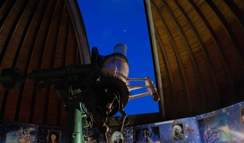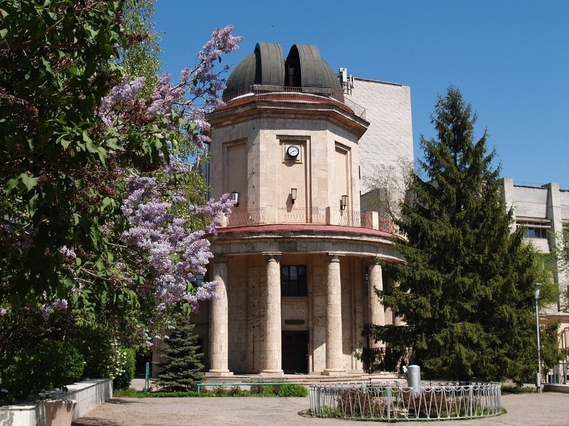 С тыльной стороны здания вы можете увидеть купол волгоградской обсерватории, в котором размещен оптический телескоп для практических наблюдений за Солнечной системой.