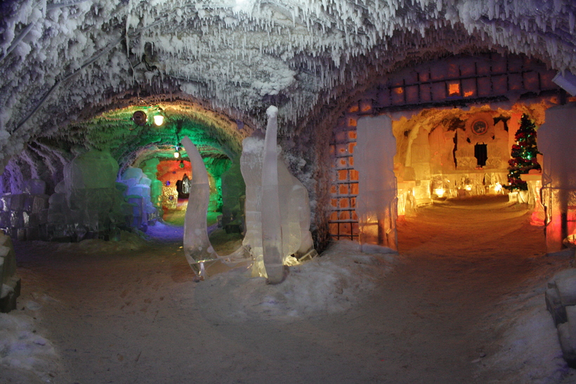Чем примечательно это место? Во-первых, своим расположением. Это старые складские помещения, ледники, вырытые в горе. Здесь несколько тематических залов, доступных посетителям, а закрытые двери, ведущие вглубь, заставляют воображение работать с удвоенной силой. Во-вторых, вечная мерзлота: здесь вы сможете увидеть, что это такое и даже потрогать. В-третьих, ледяные скульптуры и инсталляции. А еще здесь есть бар, в котором можно испить водку или шампанское из ледяной посуды и закусить строганиной.