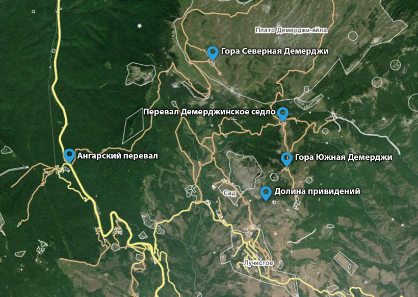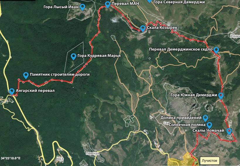 Гора Демерджи в Крыму занимает огромную территорию, и ее можно условно поделить на северную и южную части, которые соединены между собой перевалом. На карте видно, что к северной части ведет тропа с Ангарского перевала, а к южной Демерджи, где и расположена Долина привидений, маршрут начинается у села Лучистое.