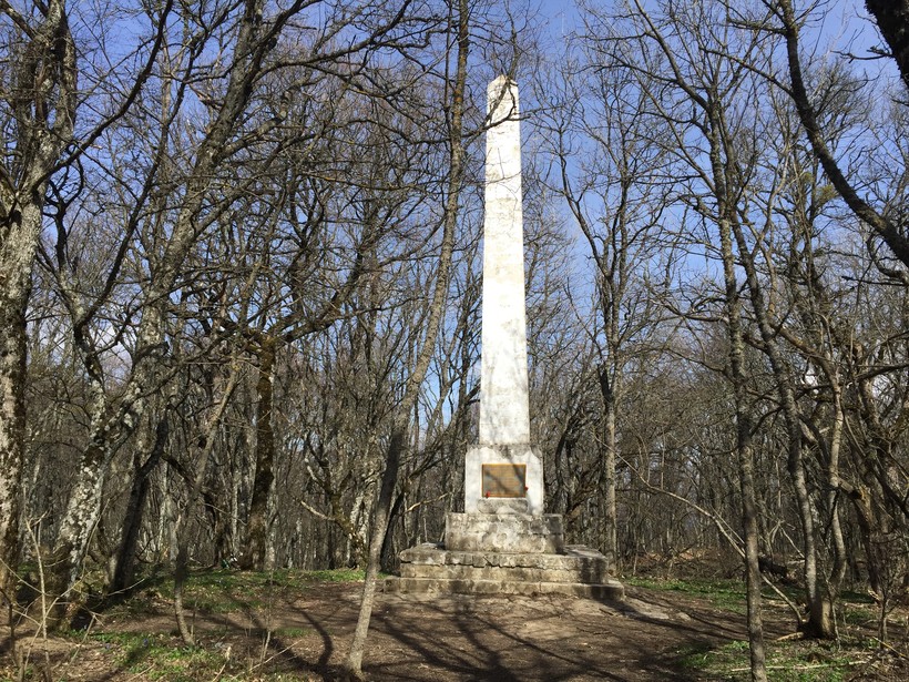 По ней вы пройдёте около километра и выйдете к высокому белому обелиску. Он был поставлен в честь строителей первой шоссейной дороги из Алушты в Симферополь. Раньше дорога проходила где-то поблизости. Строили её тут в далёких 1824-1826 годах.