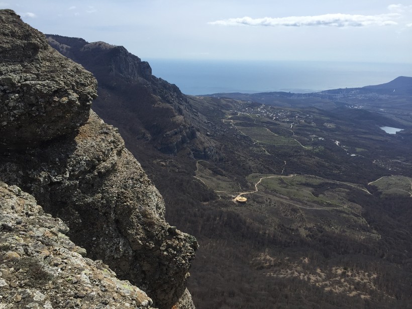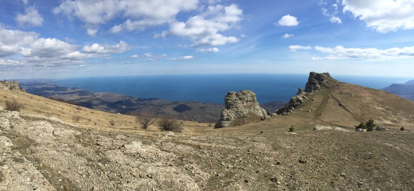 От перевала МАН есть и альтернативный путь к Демерджинскому седлу. Вы можете не идти наверх к пещере МАН, а сразу подняться метров сто по скальнику и свернуть на тропу, ведущую направо. Тропа очень живописна – с неё открывается вид на Чатырдаг, немного уже заметна Долина привидений Крыма, Алушта. Стоять на смотровой площадке скалы Козырёк немного страшно, но очень круто.