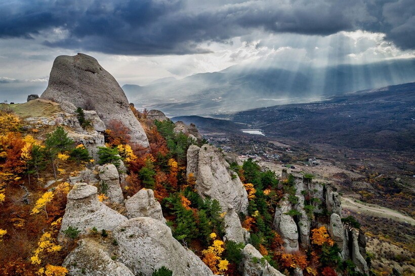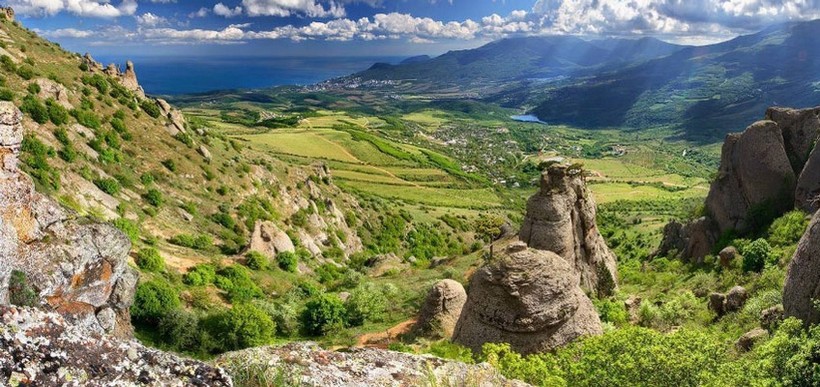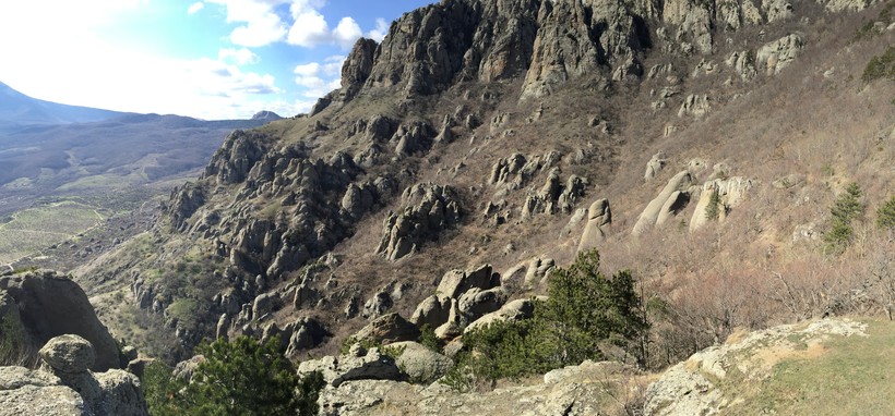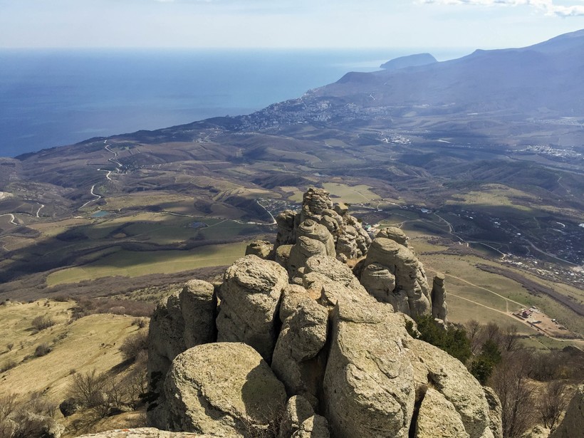 Тропа пойдёт дальше вправо и меньше чем через километр выведет вас на Солнечную поляну. Это широкая поляна в окружении камней-башен. Самый большой из них — скала Печ-Хая. Обойдите этот валун справа и полюбуйтесь сверху на Долину привидений. Здорово, если вы подгадаете так, чтобы оказаться на поляне, когда солнце начнёт садиться за Демерджи. Тогда вы оцените игру теней и увидите каменных великанов во всей красе. В это время может показаться, что они вот-вот сойдут со своих мест.