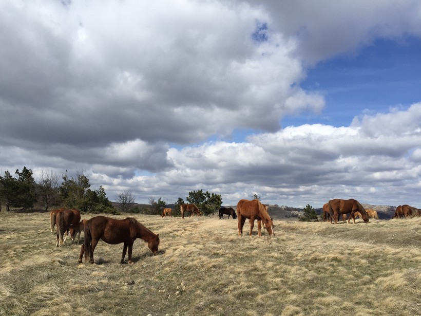 Почему я люблю именно этот маршрут на склонах Демерджи? За его разнообразие: буковый лес, виды с отвесных скал, луга, необычные каменные изваяния, панорамы с морем, закатные тени на Долине привидений. И за сюрпризы, которыми он всегда балует. Например, можно встретить стадо домашних лошадей, которые мирно пасутся на лугах Демерджи.