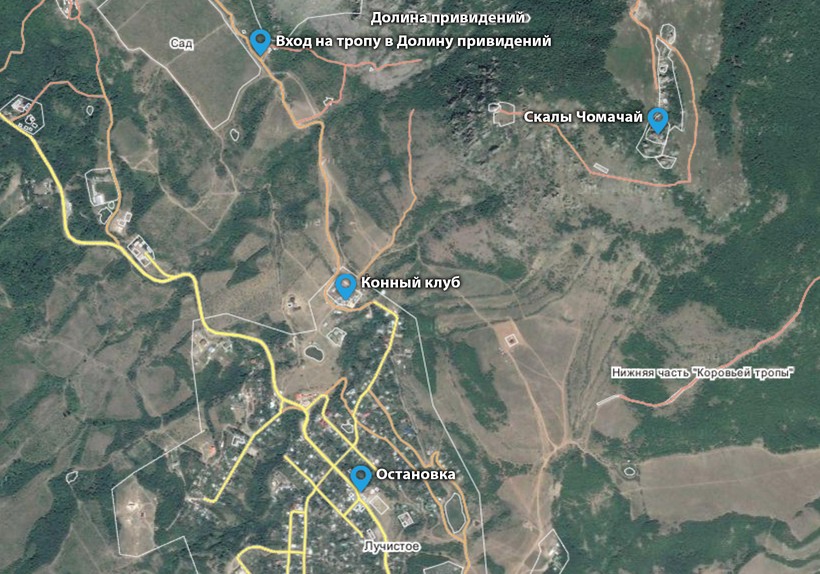 От остановки в селе вернитесь по трассе 100 метров назад и на первом перекрестке сворачивайте направо на улицу Горная. Вы пройдёте конный клуб «Золотая подкова». Вам предложат коней напрокат, но учтите, что до Долины привидений они вас довезти всё равно не смогут. Через полтора километра пути от остановки будет поворот направо. Здесь можно выйти к тропе на Долину Привидений. Плюс — проход бесплатный. Минус — не увидите знакомые места из советских фильмов.