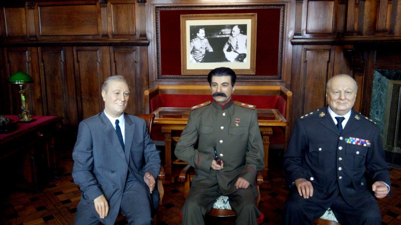 В конце войны, в феврале 1945 года, во дворце состоялась знаменитая Ялтинская конференция ООН с главами трех государств: Сталиным, Черчиллем и Рузвельтом. Одна из экспозиций дворца посвящена этому событию. Американская делегация жила в самом дворце. Рузвельт был уже старенький и на коляске, и его поселили в соседней комнате от зала заседаний, чтобы далеко не ходить. Три восковых правителя сидят рядышком и улыбаются. А Сталин неловко держит трубку, и кажется, что она вот-вот проткнет ему китель :).