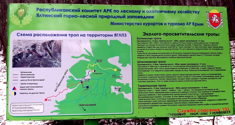 Штангеевская тропа начинается от водопада Учан-Су. Как до него добраться из Ялты, можно в подробностях почитать здесь. Начало пути отмечено вывеской-схемой всех троп. Так что, доехав до водопада, вы точно найдете выход на тропу. Сам Учан-Су является нехилой достопримечательностью — шутка ли дело, самый высокий водопад в Европе. Поэтому совместить посещение троп и водопада настоятельно рекомендуется.