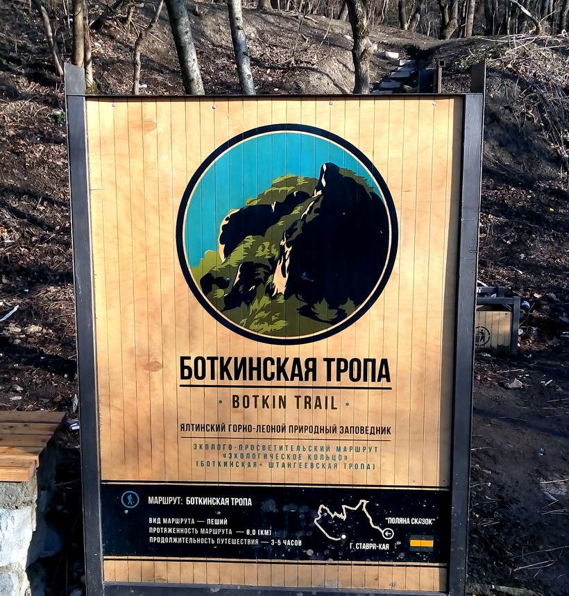 Боткинская же тропа начинается от зоопарка «Поляна Сказок». Добраться туда можно на автобусе №24, следующим от известной всем туристам остановки «Спартак», что находится в центре Ялты, стоимость проезда — 13 рублей (на весну 2017 года). Выйдя на конечной, нужно пройти вверх по дороге метров 100, и справа будет поворот на тропу, обозначенный вот этим указателем.