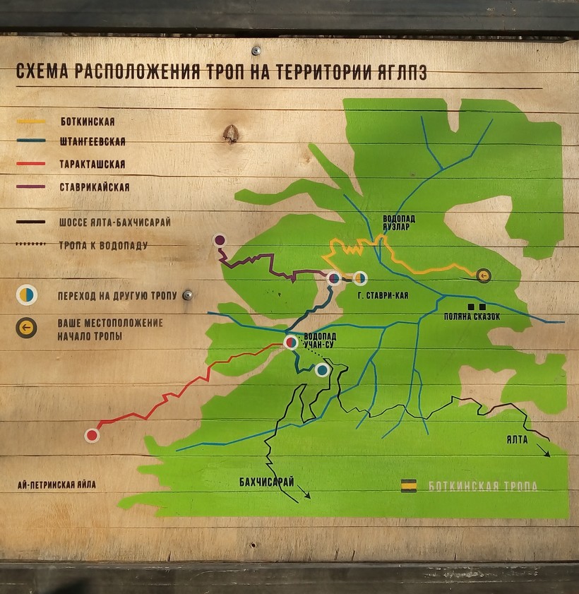 А вот еще одна подробная схема троп, которая висит около начала Боткинской тропы у «Поляны сказок». На ней видно, что от Боткинской тропы начинается еще одна тропа — Ставрикайская. Эта тропа также ведет на ай-петринское плато, но не так красива, как Таракташская. Обычная лесная тропка, идущая по хребту. Также тут обозначена тропка до водопада Учан-Су. Эта тропка ведет к нижней смотровой площадке — самой известной и популярной среди туристов, на которую можно подъехать на машинах. Водопад состоит из двух больших порогов, так вот эта тропка сворачивающая со Штангеевской тропы идет на довольно большую площадку между порогами, где стоит знаменитая скульптура золотого орла. Побывать там почти как побывать в сердце этого водопада. Ну и вид на водопад оттуда совсем другой, и можно посмотреть сверху как он падает вниз. Захватывающее зрелище!