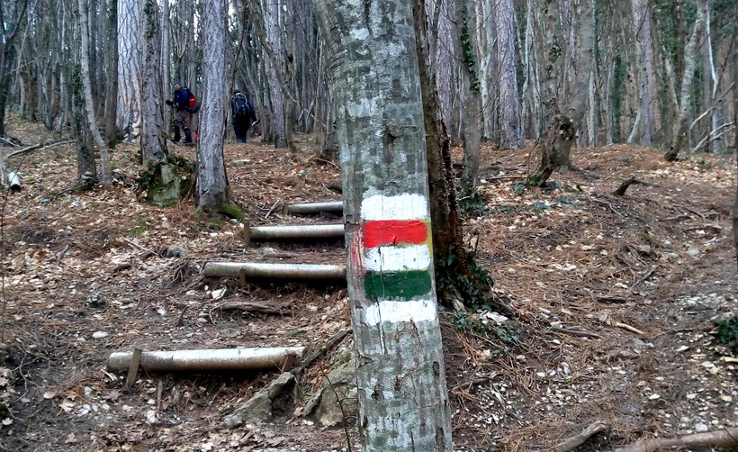 А вот так выглядит маркировка на тропах. Штангеевская обозначена зеленым цветом, Таракташская — красным, а Боткинская (если мне не изменяет память) — желтым. Начало Штангеевской и Таракташской троп совпадают от водопада до развилки, поэтому этот участок маркирован знаками обеих троп.