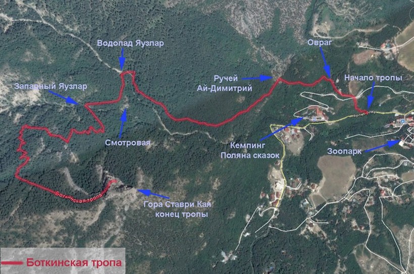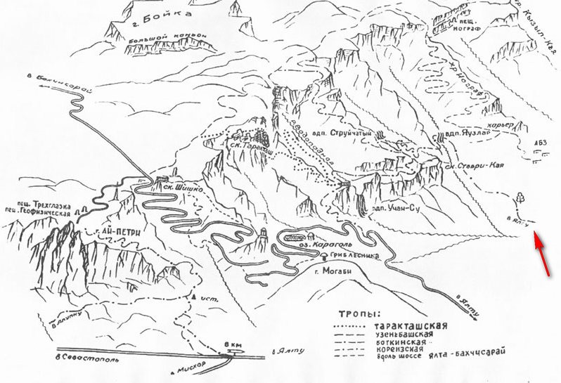 А вот более подробная схема различных троп, ведущих из разных мест на ай-петринское плато. Боткинская обозначена стрелочкой :)