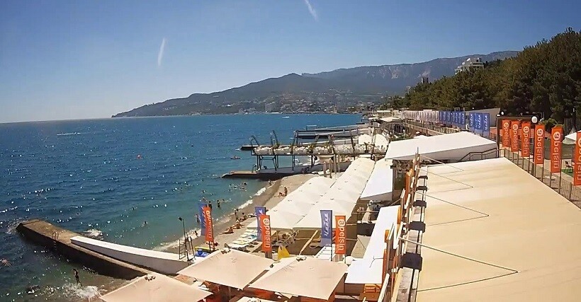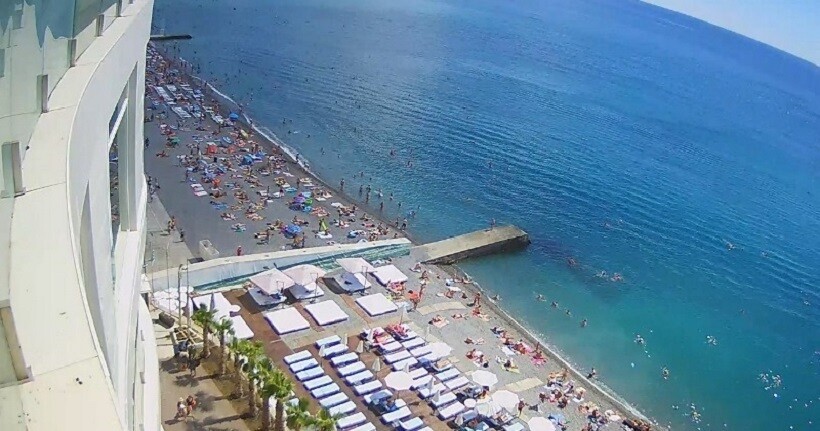 - Видеокамера у кафе «Апельсин». Она лучше других передаёт картинку с пляжа. Видно и количество отдыхающих, и погоду, и развлечения для туристов. Кроме того, можно посмотреть, есть ли свободные места за столиками кафе.