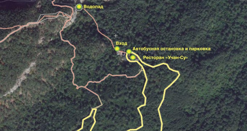 - На личном автомобиле. Это, конечно, проще всего. Выезжайте из Ялты на Южнобережное шоссе, которое идёт практически по верхней границе города. Вам надо ехать в сторону Севастополя. Если ехать от Ялтинского автовокзала, то примерно через 7 километров на трассе будет поворот к санаторию «Узбекистан». Остановка так и называется. Поворот будет справа, и его вы никак не пропустите — там есть большой указатель. Здесь же надо поворачивать, ведь расположен водопад по дороге на Ай-Петри. Точные координаты поворота: 44°28′48.8″N 34°07′56.5″E .