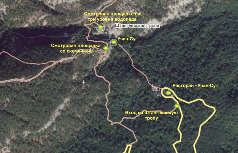 Знаю, что многие интересуется, как подняться на верхний каскад Учан-Су, где находится здание с орлом. К сожалению, уже лет как 20 лестница, ведущая наверх, находится в аварийном состоянии и закрыта для посетителей. Но вы можете поискать тропинку, которая соединяет Штангеевскую тропу с этим верхним каскадом. Возле «орла» и правда красиво — здесь, в большой заводи, можно даже искупаться.