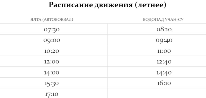 Иногда зимой на указателе написано «Проезд закрыт». В таком случае на водопад Учан-Су как добраться? Дело в том, что имеется в виду доступность дороги до Ай-Петри, а на Учан-Су вы в любом случае попадете. После поворота вас ждут несколько километров пути среди леса. Покрытие дороги асфальтированное и хорошее, но с непривычки может укачать на постоянном серпантине. Вы проедете санаторий «Узбекистан», частные виллы, кладбище, Ялтинскую акваторию. Возле ресторана «Учан-Су» надо припарковать автомобиль и оставшиеся 300 метров пройти пешком. Не расстраивайтесь, если места на парковке не нашлось. Даже лучшим вариантом будет запарковать авто где-нибудь выше или ниже вдоль дороги. - На автобусе. Тут всё проще простого. Садитесь на автобус № 133, который отправляется с нижней платформы автовокзала Ялты. Желательно прийти на остановку минут за 10-15, потому что автобус всего один, и на него всегда есть очередь из желающих. Плюс водитель подъезжает, загружается и сразу отправляется. Иногда даже на несколько минут раньше. Смотрите расписание. Стоимость проезда — 20 рублей.