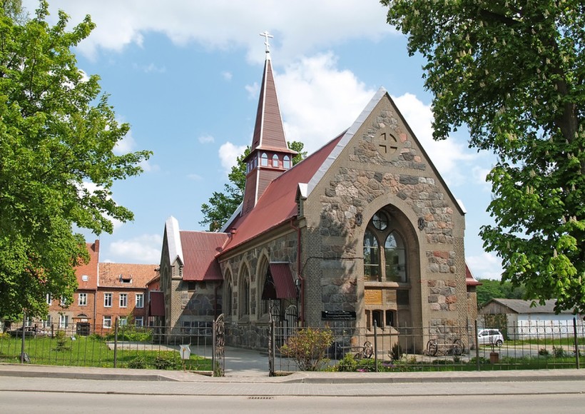 Евангелистская кирха была построена напротив усадьбы Мориса Беккера, которая имеет замечательную историю, начавшуюся еще в XVII веке, когда здесь располагался охотничий замок курфюрста Георга Вильгельма. После его смерти в здании располагались различные государственные учреждения, но уже в 1703 году первым прусским королем Фридрихом I здесь был восстановлен и расширен охотничий замок. Морис Беккер купил здание в 1780 году у тогдашнего владельца, господина Штайна. Беккер снес замок и на старых фундаментах возвел новое роскошное здание. С 1899 года сооружение находится в собственности прусского государство и служит отелем под названием Schloss-hotel, то есть «Отель в замке».