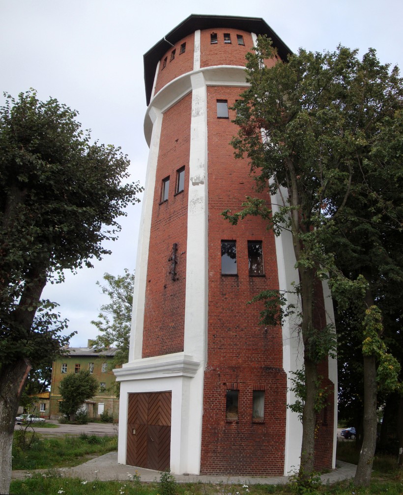 Башня — это, скорее всего, первое, что вы увидите, приехав в Янтарный. Это нарядное сооружение из красного кирпича с белой окантовкой, построенное еще в 1920 году, и сегодня работает как водонапорная башня.