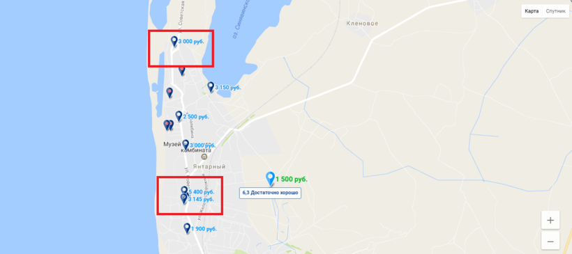 Собственно, перечисленные выше отели — это все, что есть в Янтарном. Другое предлагаемое жилье — это частные квартиры или дома, расположенные, в основном между южным и северным концами променада (на карте выше отмечены именно они). Поискать варианты и сравнить цены на них можно, например, здесь.