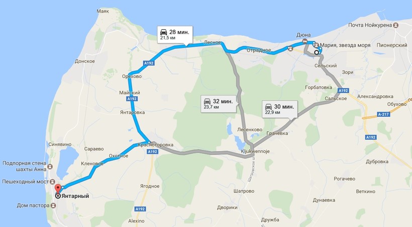 Я подробно описывала поездку на автомобиле в Светлогорск здесь. В Янтарный едем аналогично, через Светлогорск. Расстояние от Светлогорска до Янтарного составляет 20 км. Поездка займет приблизительно полчаса.