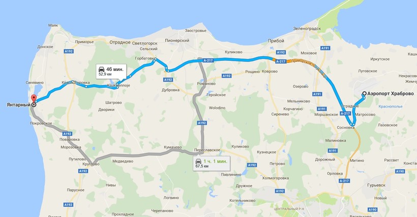 Аэропорт Храброво находится в 48 км. от Янтарного. Из аэропорта можно добраться на такси. Дорога займет не более часа. Если хотите сэкономить, можно доехать и на автобусе из аэропорта до автовокзала Калининграда, а уже оттуда до Янтарного. На такую дорогу закладывайте (с учетом пересадки) 2,5 часа. Правда, и дешевле это будет раз в 5 (на такси уйдет примерно 1000 рублей, а на автобусную поездку вы потратите не более 200).