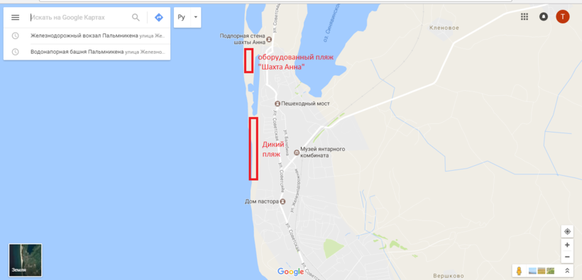 Расположение двух наиболее известных пляжей Янтарного можно увидеть на карте ниже.