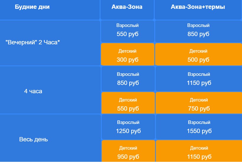 - аквазона: 4 ч. в дневное время — 550 ₽, тариф «Вечерний» — 300 ₽, весь день — 950 ₽: