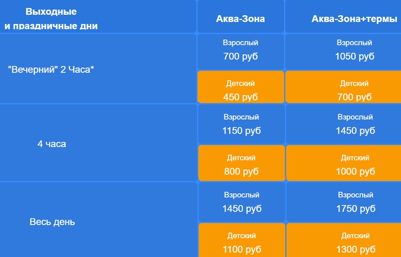 - дневной четырехчасовой тариф: для лиц выше 1,5 м аквазона — 1150 ₽, аквазона и термы — 1450 ₽, для детей — 800 ₽ и 1000 ₽ соответственно;