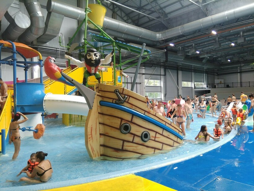 Юные гости аквапарка «Тропический остров» в Ярославле могут провести время в Аквагороде с неглубокими бассейнами (не более 0,5 м), фонтанами и горками разной высоты, стилизованными под пиратский корабль.