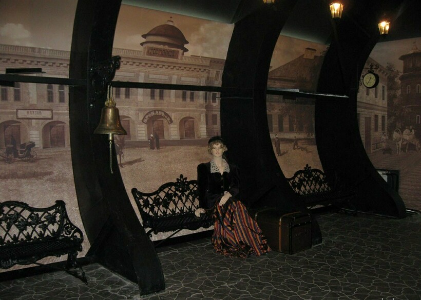Войдя в первый зал музея, вы попадаете на перрон вокзала XIX века. Около входа можно увидеть фигуру станционного смотрителя и девушки в ожидании поезда. Атмосферу вокзала позапрошлого века усиливают кованый фонарь и колокол, который подает сигналы о прибытии и отправлении поезда.