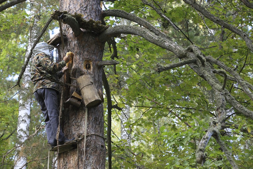 На нескольких деревьях есть ульи лесных пчел – бортья – и специальные приспособления для пасечников, собирающих этот мед. Такой способ сбора меда называется бортевое пчеловодство, когда ульи устраивают в дуплах высоких деревьев. Он традиционен для башкирских народов, и мне было просто любопытно посмотреть на такое, так как раньше ничего подобного я не встречала.