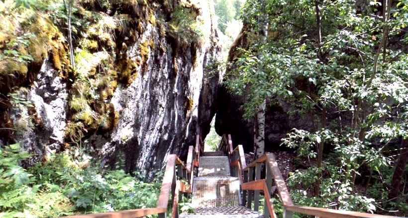 От пещеры тропа ведет к Большому провалу – карстовой трещине в земле. В провал спускается лестница, там тоже прохладно, бегут ручейки, камни покрыты древним мхом и лишайником. Сказочный и самый желанный для всех туристов объект. Нас, помнится, потащила туда учительница классе в 5. Шел дождь дорожки были грязные и скользкие, мы вымокли и устали как собаки, были злющие на природу, погоду и учительницу, но когда мы оказались возле провала, всю злость и страдания как рукой сняло. Наши челюсти отпали на грудь и мы еще долго не могли вернуть их на место. Настолько завораживающа и необычна эта трещина. И так мощно она подействовала на впечатлительное детское сознание, что на обратном пути мы перевоплатились из ноющей детской толпы в молчаливых, думающих о вечном путниках. Побывать в Оленьих Ручьях и не заставить себя дойти до Провала – вопиющее кощунство.
