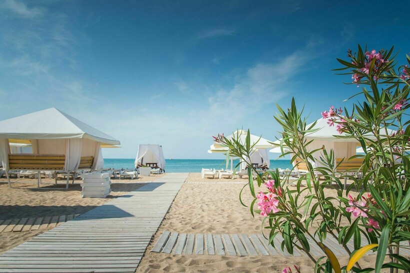 Береговая зона покрыта мягким песком, имеет удобный вход в море, не отличается большой шириной — всего 40 м. Для комфортного передвижения песок покрыт деревянными дорожками.