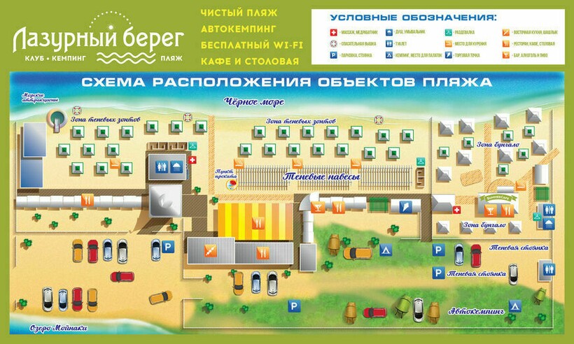 «Солярис» — очень популярное, а потому многолюдное место. Если приехать сюда в сезон после 09.00, найти удобное место — большая удача. В начала лета и осени проблем со свободными площадями нет.
