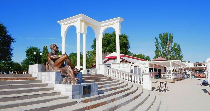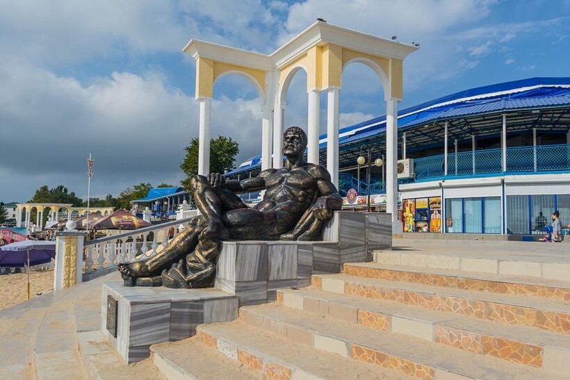 ПОЛЕЗНО! Главный вход на Центральный пляж Евпатории расположен рядом с парком Фрунзе. К побережью спускается широкая лестница, на которой установлена скульптура Геракла.