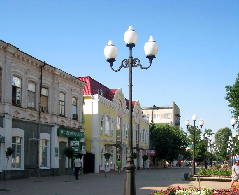Центральная пешеходная улица Ейска, вдоль которой расположено множество кафе, закусочных и ресторанчиков на открытом воздухе. Уютное и милое место для вечернего променада.